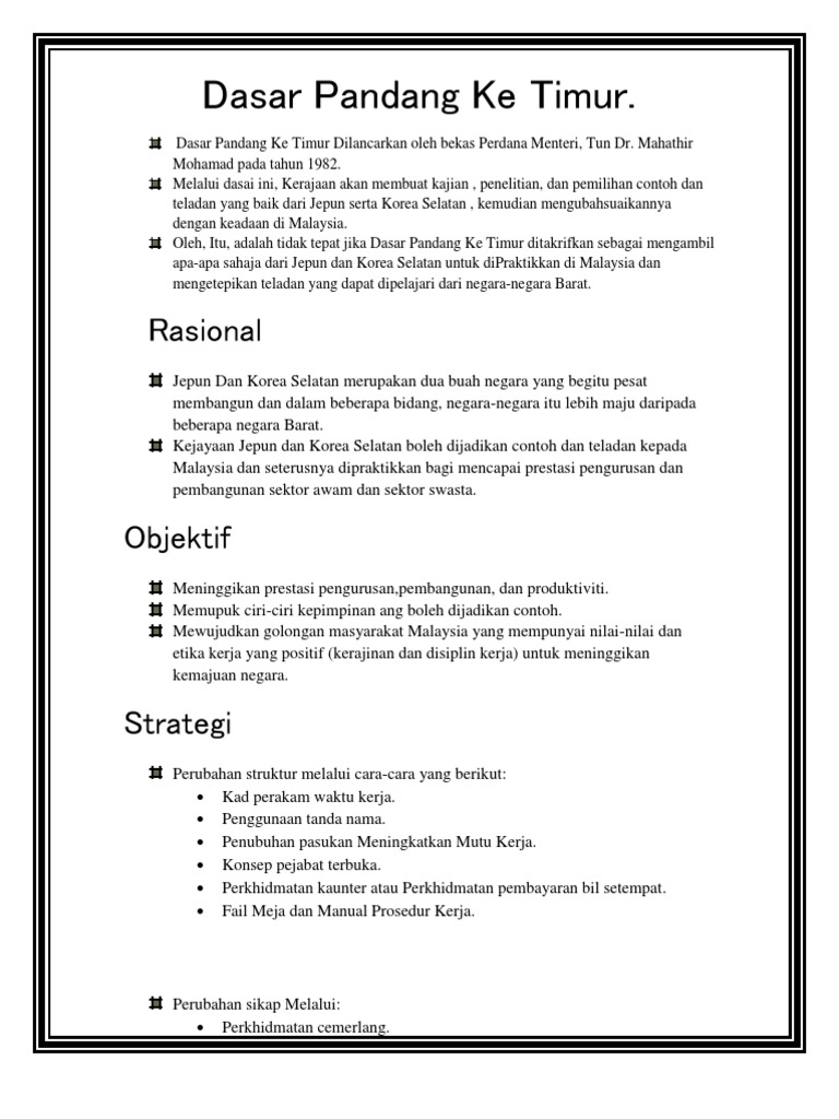 Oleh Dr Shukri Shuib - Jun 21 2022 745pm. Pembangunan di negara ini serta mewujudkan golongan masyarakat. Objektif utama Dasar Pandang Ke Timur ini ialah untuk meninggikan prestasi pengurusan dan.
