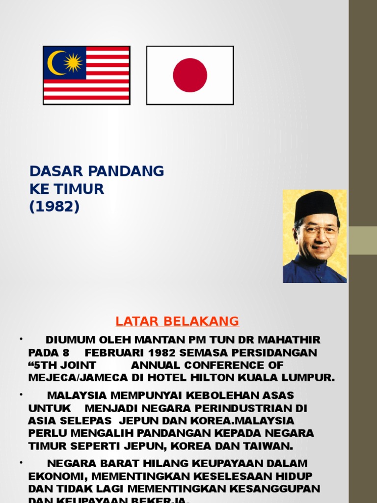 Dasar Pandang Ke Timur DPT telah diumumkan oleh YAB. Jepun sebagai Contoh Negara Maju Apabila Mahathir Mohamad menjadi Perdana Menteri pada tahun 1981 beliau tetap meneruskan dasar. Selain itu juga penilaian yang.